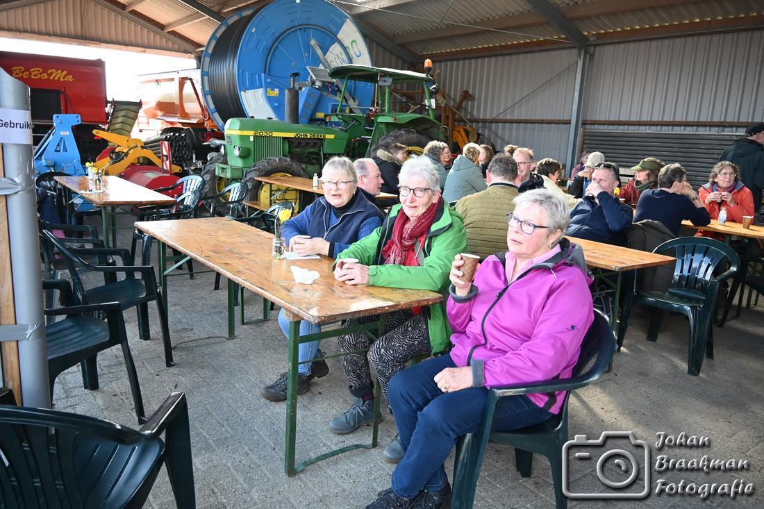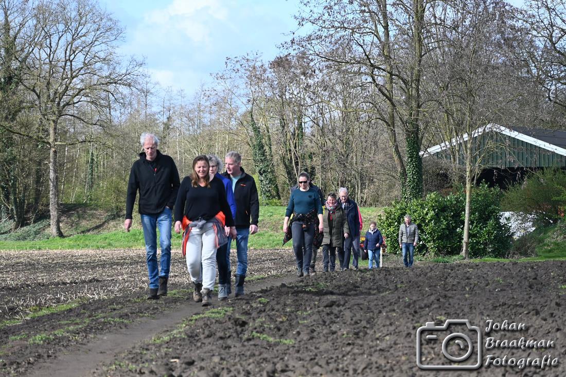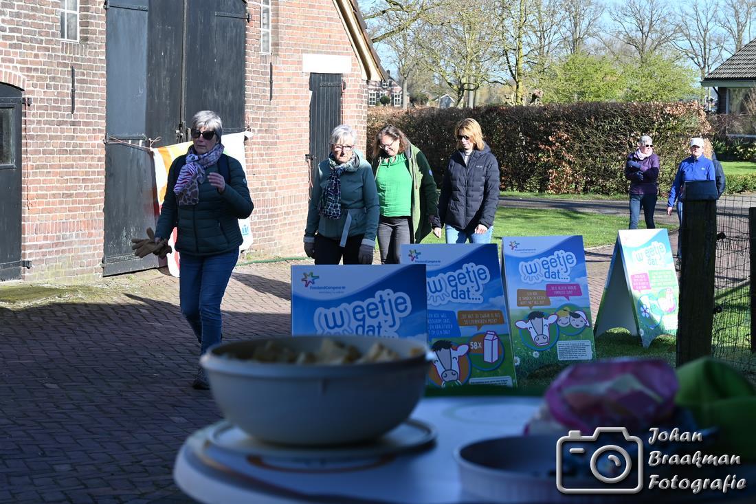 De route voerde verder over het erf van een akkerbouwer, waar ook de rustplek was ingericht. Daarna ging de wandeling langs de koeienstal van Burgerboerderij De Patrijs, waar wordt gewerkt aan gezond voedsel en een levendig landschap. Ook kwamen de wandelaars bij een moderne melkveehouderij, waar een melkrobot en voerrobot het werk ondersteunen. Deze draaien op elektriciteit die wordt opgewekt met zonnepanelen, zodat de boer zich kan richten op het behoud van het mooie landschap in samenwerking met Agrarische Natuurvereniging ’t Onderholt.